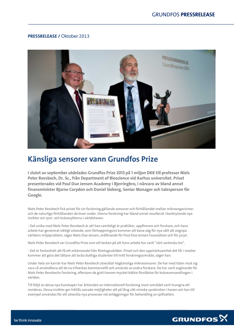 I slutet av september utdelades Grundfos Prize 2013 på 1 miljon DKK till professor Niels Peter Revsbech, Dr. Sc., från Department of Bioscience vid Aarhus universitet. Priset presenterades vid Poul Due Jensen Academy i Bjerringbro, i närvaro av bland annat finansminister Bjarne Corydon och Daniel Sieberg, Senior Manager och talesperson för Google.