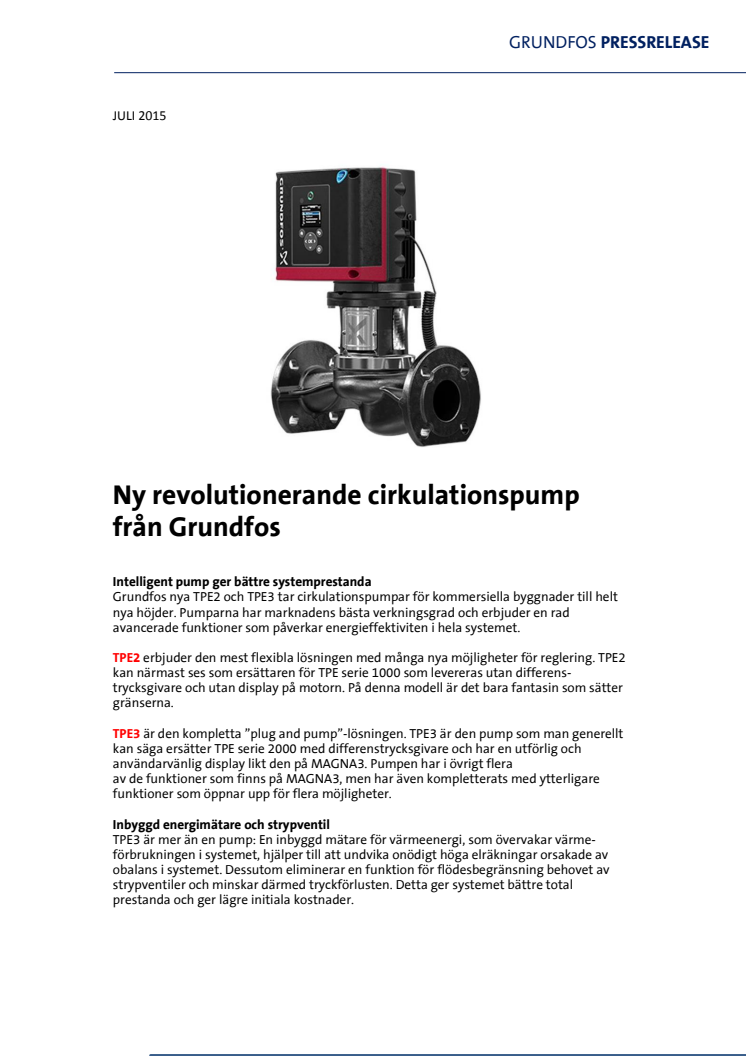 Grundfos nya TPE2 och TPE3 tar cirkulationspumpar för kommersiella byggnader till helt nya höjder. Pumparna har marknadens bästa verkningsgrad och erbjuder en rad avancerade funktioner som påverkar energieffektiviten i hela systemet.