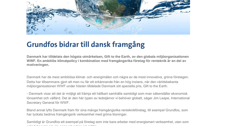 Bland annat lyfts Danmark fram för sina många framgångsrika renteknikföretag, till exempel Grundfos, som har lyckats bedriva framgångsrik verksamhet med gröna lösningar.