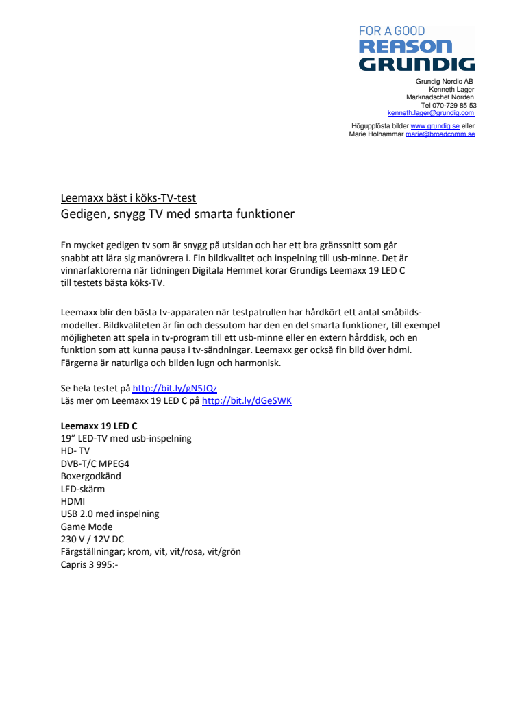 En mycket gedigen tv som är snygg på utsidan och har ett bra gränssnitt som går snabbt att lära sig manövrera i. Fin bildkvalitet och inspelning till usb-minne. Det är vinnarfaktorerna när tidningen Digitala Hemmet korar Grundigs Leemaxx 19 LED C till testets bästa köks-TV.