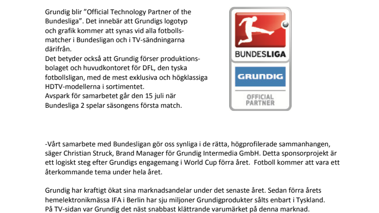 Grundig blir ”Official Technology Partner of the Bundesliga”. Det innebär att Grundigs logotyp och grafik kommer att synas vid alla fotbollsmatcher i Bundesligan och i TV-sändningarna därifrån.