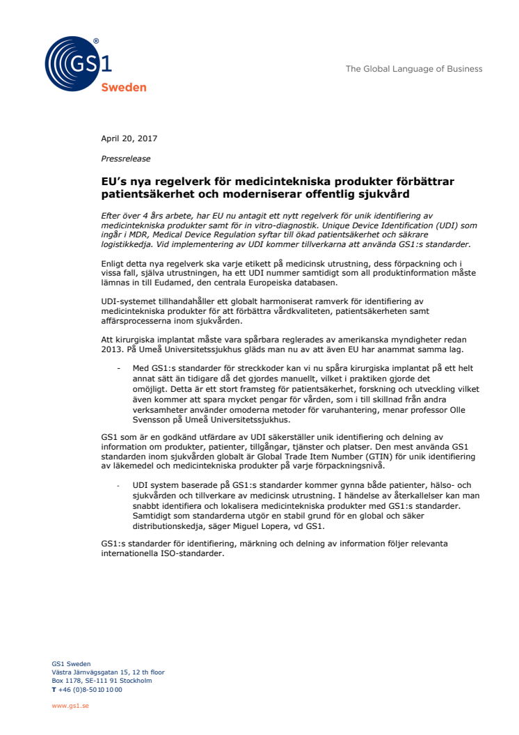 Efter över 4 års arbete, har EU nu antagit ett nytt regelverk för unik identifiering av medicintekniska produkter samt för in vitro-diagnostik. Unique Device Identification (UDI) som ingår i MDR, Medical Device Regulation syftar till ökad patientsäkerhet och säkrare logistikkedja. Vid implementering av UDI kommer tillverkarna att använda GS1:s standarder.
