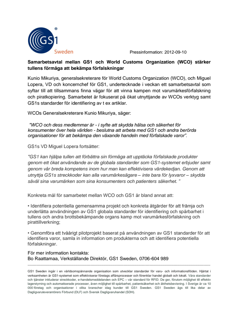 • Samarbetsavtal mellan GS1 och World Customs Organization (WCO) stärker tullens förmåga att bekämpa förfalskningar