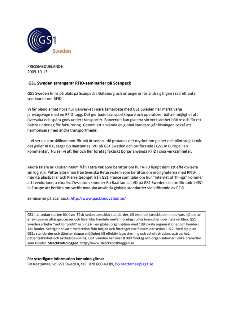 • GS1 Sweden arrangerar RFID-seminarier på Scanpack