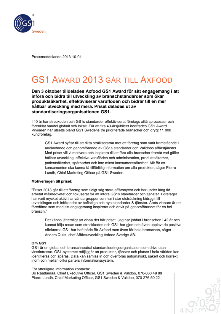 • GS1 AWARD 2013 GÅR TILL AXFOOD
