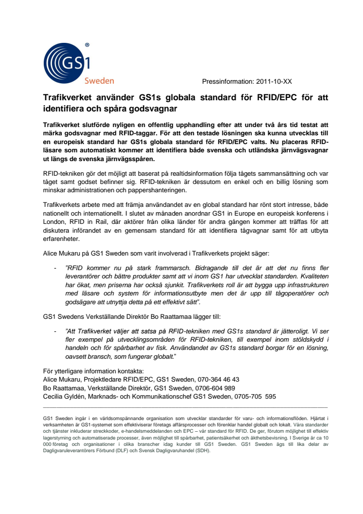 • Trafikverket använder GS1s globala standard för RFID/EPC för att identifiera och spåra godsvagnar