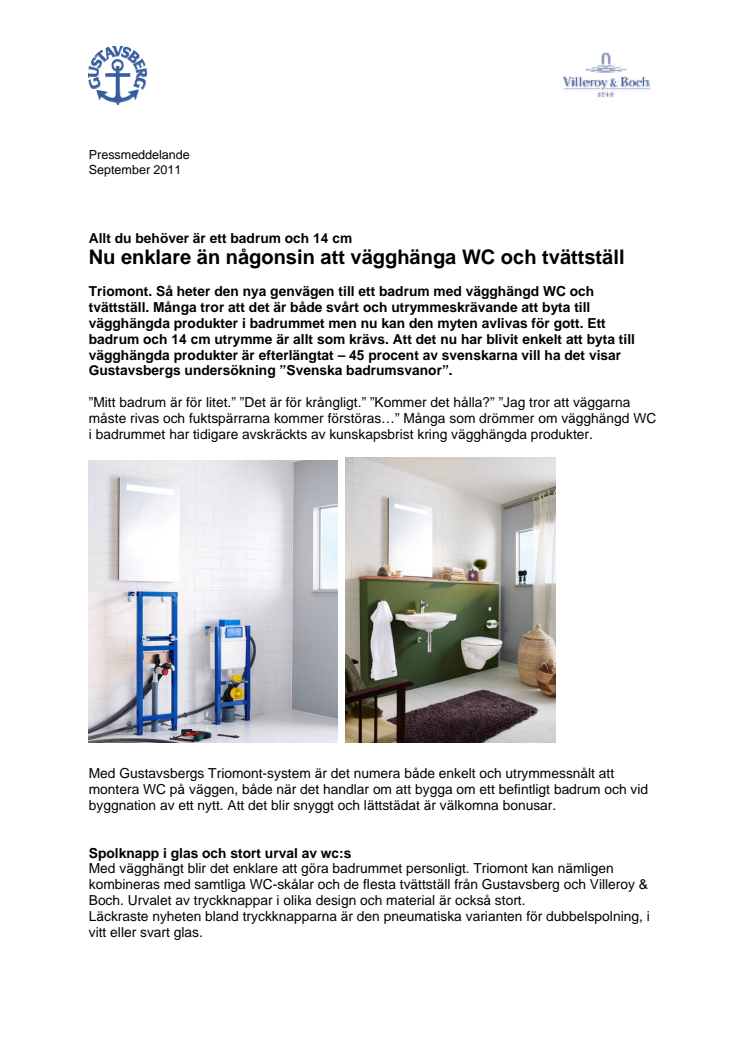 Triomont. Så heter den nya genvägen till ett badrum med vägghängd WC och tvättställ. Många tror att det är både svårt och utrymmeskrävande att byta till vägghängda produkter i badrummet men nu kan den myten avlivas för gott. Ett badrum och 14 cm utrymme är allt som krävs.