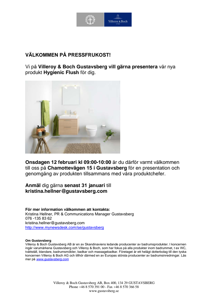 Under en pressfrukost hos oss på Chamottevägen 15 i Gustavsberg onsdagen 12 februari kl 09:00-10:00 presenterar vi på Villeroy & Boch Gustavsberg vår nya produkt Hygienic Flush. Välkommen med din anmälan till Kristina Hellner senast 31 januari.