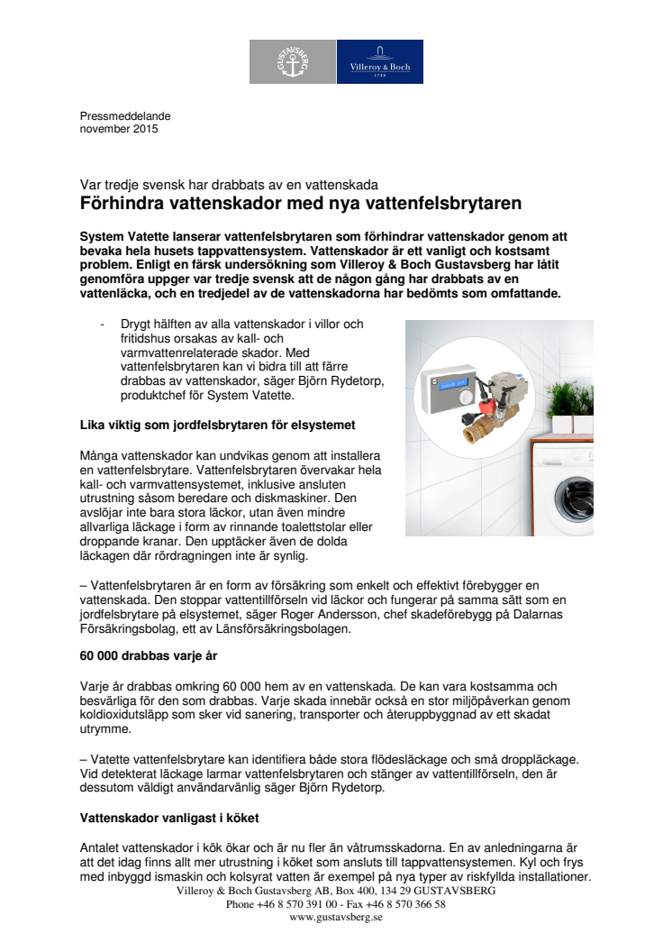 System Vatette lanserar vattenfelsbrytaren som förhindrar vattenskador genom att bevaka hela husets tappvattensystem. Vattenskador är ett vanligt och kostsamt problem. Enligt en färsk undersökning som Villeroy & Boch Gustavsberg har låtit genomföra uppger var tredje svensk att de någon gång har drabbats av en vattenläcka, och en tredjedel av de vattenskadorna har bedömts som omfattande.