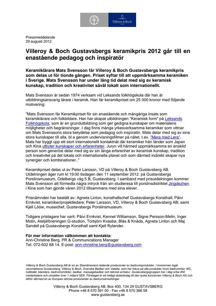 Villeroy & Boch Gustavsbergs keramikpris 2012 går till en enastående pedagog och inspiratör