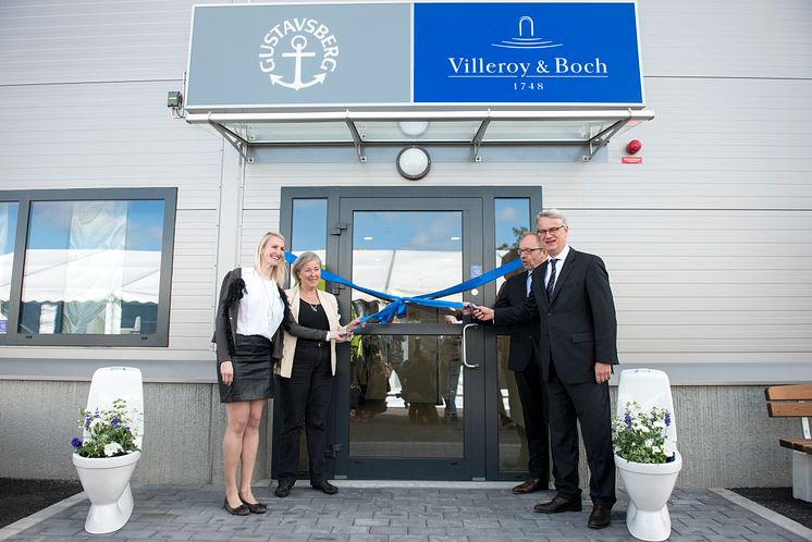 Från vänster: Katharina Klotz, Marketing Manager Villeroy & Boch Gustavsberg, Monica Pettersson, kommunstyrelsens ordförande Värmdö, Andreas Pfeiffer, Division Manager Bath & Wellness Villeroy & Boch och Frank Göring, CEO Villeroy & Boch.