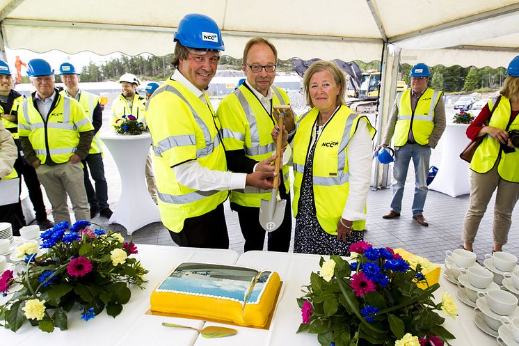 Ekobacken är platsen för Villeroy & Boch Gustavsbergs nya anläggning för logistik och montering i Gustavsberg. Måndagen 16 juni togs det första symboliska spadtaget för fabriken. På bilden syns Peter Larsson; VD på Villeroy & Boch Gustavsberg, Andreas Pfeiffer; divisionschef Bath & Wellness på Villeroy & Boch samt Monica Pettersson; kommunstyrelsens ordförande i Värmdö Kommun.