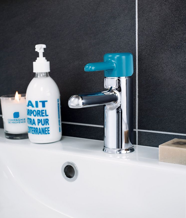 Tvättställsblandare ur Gustavsbergs Logic-serie i petroleumblått.