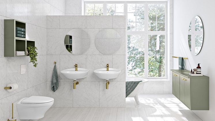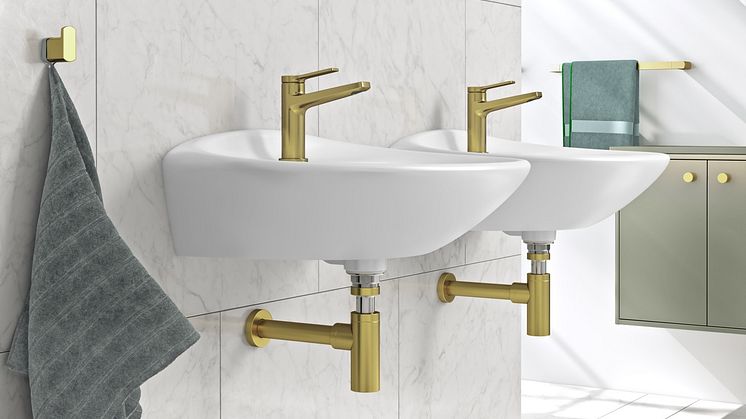 På bilden: Epic tvättställsblandare och vattenlås i mässing. Komplettera med badrumstillbehör i mässing från serierna Round & Square.