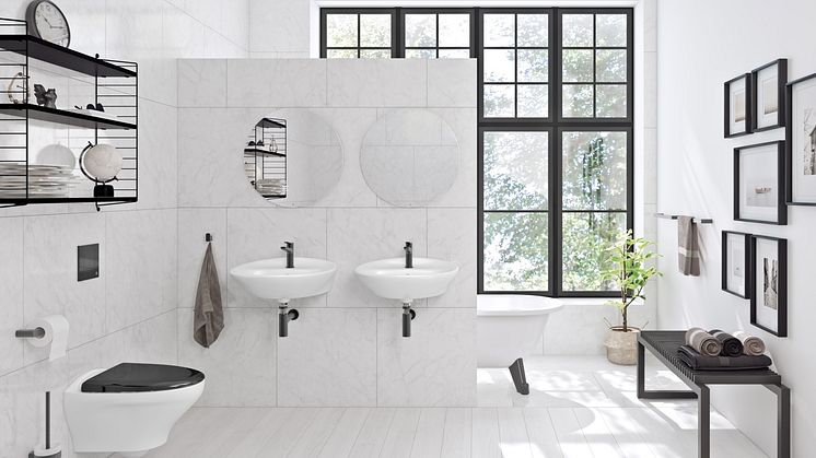 Epic tvättställsblandare och vattenlås i matt svart. Kombinera med matt svarta badrumstillbehör som handduksstång, handdukskrok, toalettpappershållare och toalettborstehållare ur serien Square.