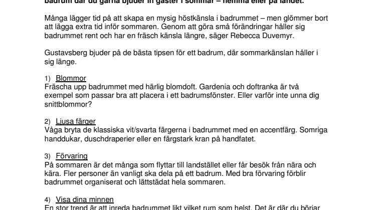 - Många lägger tid på att skapa en mysig höstkänsla i badrummet – men glömmer bort att lägga extra tid inför sommaren. Genom att göra små förändringar håller sig badrummet rent och har en fräsch känsla längre, säger Rebecca Duvemyr.