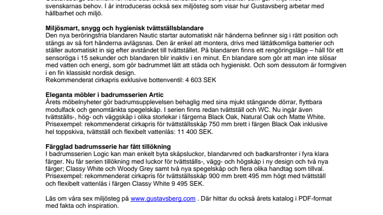 Enligt en färsk badrumsundersökning vill majoriteten av svenskarna ha en skandinavisk stil med ljus inredning, luftiga ytor och vitt i sina badrum. Många vill även ha ett lättstädat och praktiskt badrum. I Gustavsbergs sortiment för hela badrummet lanseras nu fler produkter som går i linje med svenskarnas behov. I år introduceras också sex miljösteg som visar hur Gustavsberg arbetar med hållbarhet och miljö - mer om dem på www.gustavsberg.com