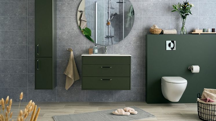 Som en händelse trendar grönt som badrumsfärg, både på inredningen och med gröna växter och textilier som accenter. De gröna möblerna i Graphicserien är ett både snyggt och funktionellt exempel. Om man räknar bort klassiskt vitt är det fortfarande naturnära färger och naturmaterial som dominerar.