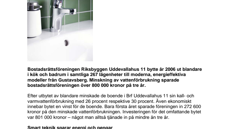 Efter utbytet av blandare minskade de boende i Brf Uddevallahus 11 sin kall- och varmvattenförbrukning med 26 procent respektive 30 procent. Även ekonomiskt innebar bytet en vinst för de boende. Bara första året sparade föreningen in 272 600 kronor på den minskade vattenförbrukningen. Investeringen för det omfattande bytet var 801 000 kronor – något man alltså tjänade in på mindre än tre år.