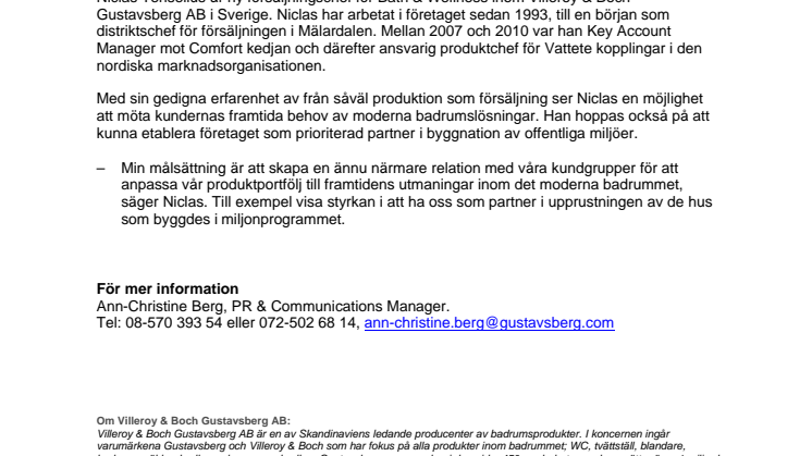 Niclas Tenselius är ny försäljningschef för Bath & Wellness inom Villeroy & Boch Gustavsberg AB i Sverige. Niclas har arbetat i företaget sedan 1993, till en början som distriktschef för försäljningen i Mälardalen. Mellan 2007 och 2010 var han Key Account Manager mot Comfort kedjan, därefter ansvarig produktchef för Vattete kopplingar i den nordiska marknadsorganisationen.