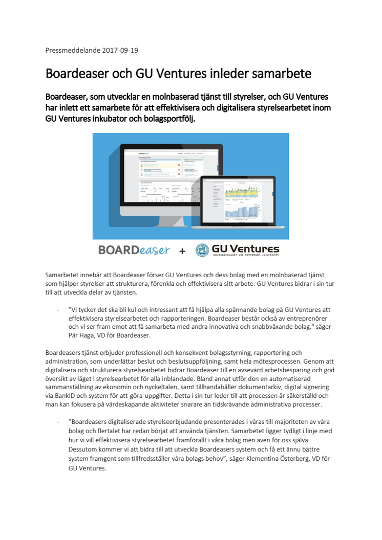 Boardeaser, som utvecklar en molnbaserad tjänst till styrelser, och GU Ventures har inlett ett samarbete för att effektivisera och digitalisera styrelsearbetet inom GU Ventures inkubator och bolagsportfölj.
