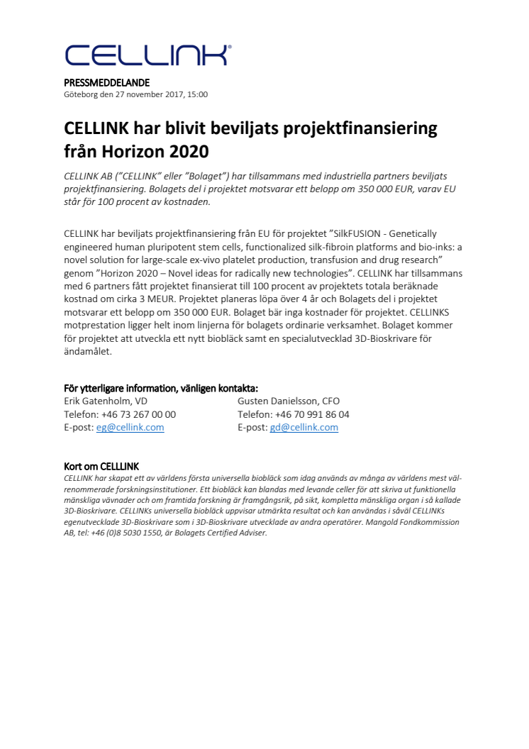 CELLINK AB (”CELLINK” eller ”Bolaget”) har tillsammans med industriella partners beviljats projektfinansiering. Bolagets del i projektet motsvarar ett belopp om 350 000 EUR, varav EU står för 100 procent av kostnaden.