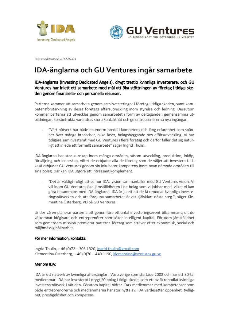 IDA-änglarna (Investing Dedicated Angels), drygt trettio kvinnliga investerare, och GU Ventures har inlett ett samarbete med mål att öka stöttningen av företag i tidiga skeden genom finansiella- och personella resurser.
