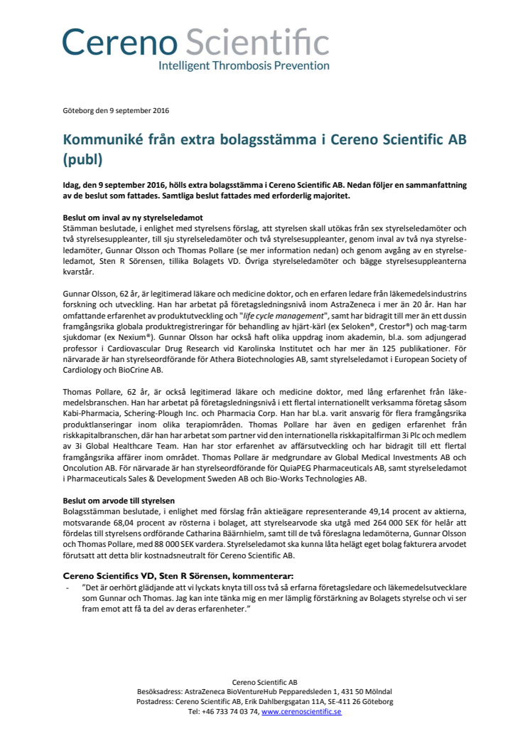 Idag, den 9 september 2016, hölls extra bolagsstämma i Cereno Scientific AB. Nedan följer en sammanfattning av de beslut som fattades. Samtliga beslut fattades med erforderlig majoritet.