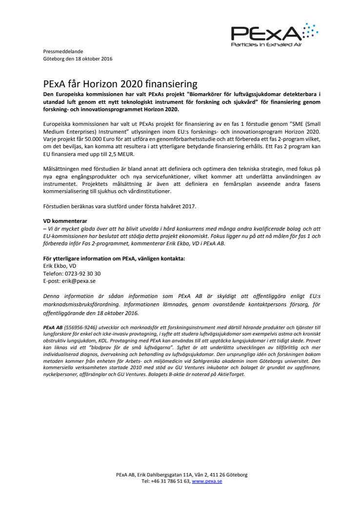 Den Europeiska kommissionen har valt PExAs projekt "Biomarkörer för luftvägssjukdomar detekterbara i utandad luft genom ett nytt teknologiskt instrument för forskning och sjukvård” för finansiering genom forskning- och innovationsprogrammet Horizon 2020 i fas 1.