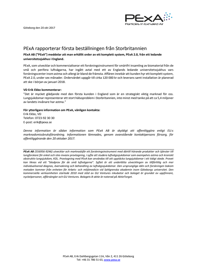 PExA AB ("PExA") meddelar att man erhållit order av ett komplett system, PExA 2.0, från ett ledande universitetssjukhus i Storbritannien.