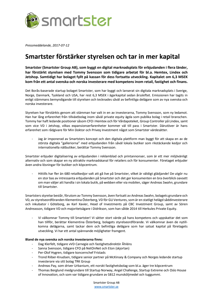Smartster (Smartster Group AB), som byggt en digital marknadsplats för erbjudanden i flera länder, har förstärkt styrelsen med Tommy Svensson som tidigare arbetat för bl.a. Hemtex, Lindex och Jetshop. Samtidigt har bolaget fyllt på kassan för dess fortsatta utveckling. Kapitalet om 6,3 MSEK kom från ett antal svenska och norska investerare med kompetens inom retail, fastighet och finans.