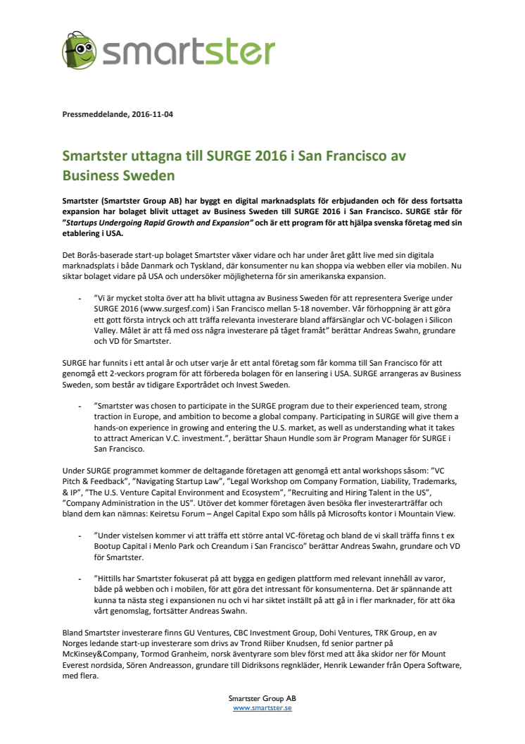 Smartster (Smartster Group AB) har byggt en marknadsplats för erbjudanden och för dess fortsatta expansion har bolaget blivit uttaget av Business Sweden till SURGE 2016 i San Francisco. SURGE står för "Startups Undergoing Rapid Growth and Expansion" och är ett program för att hjälpa svenska företag med sin etablering i USA.