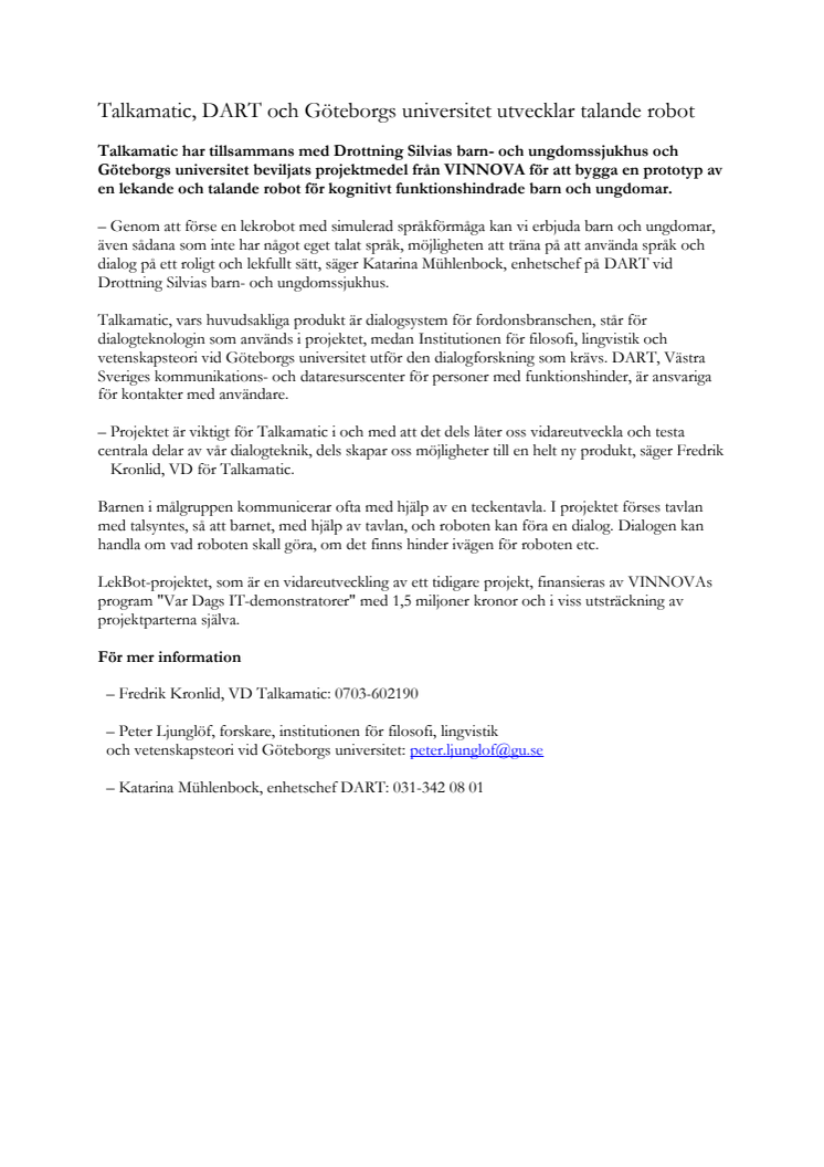 Talkamatic, delägt av GU Holding, har tillsammans med Drottning Silvias barn- och ungdomssjukhus och Göteborgs universitet beviljats projektmedel från VINNOVA för att bygga en prototyp av en lekande och talande robot för kognitivt funktionshindrade barn och ungdomar.