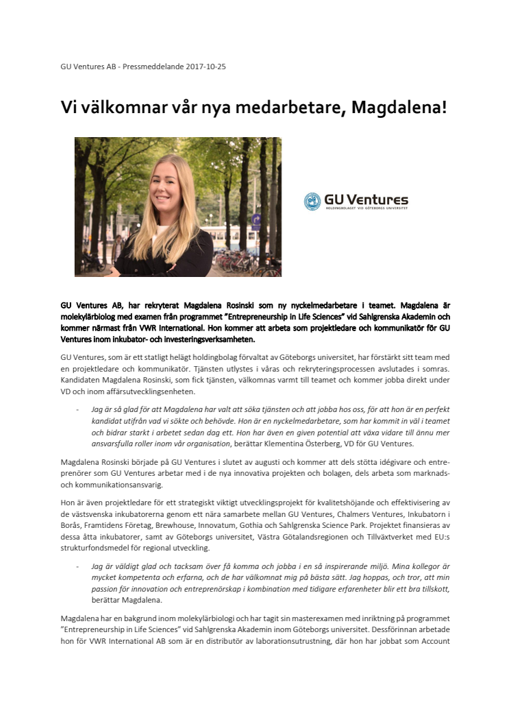 GU Ventures AB, har rekryterat Magdalena Rosinski som ny nyckelmedarbetare i teamet. Magdalena är molekylärbiolog med examen från programmet ”Entrepreneurship in Life Sciences” vid Sahlgrenska Akademin och kommer närmast från VWR International. Hon kommer att arbeta som projektledare och kommunikatör för GU Ventures inom inkubator- och investeringsverksamheten.