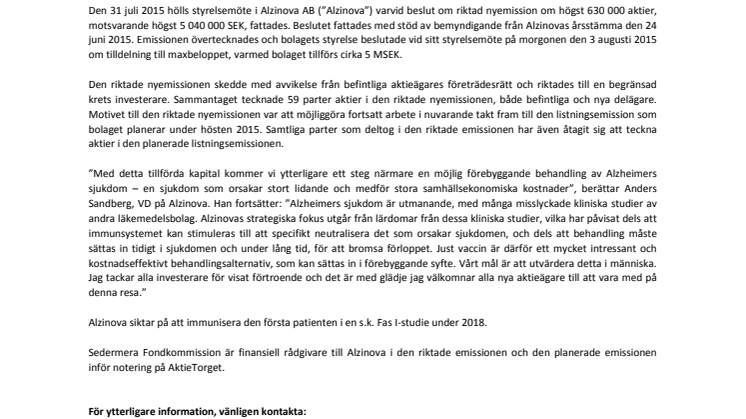 Den 31 juli 2015 hölls styrelsemöte i Alzinova AB (”Alzinova”) varvid beslut om riktad nyemission om högst 630 000 aktier, motsvarande högst 5 040 000 SEK, fattades. Beslutet fattades med stöd av bemyndigande från Alzinovas årsstämma den 24 juni 2015. Emissionen övertecknades och bolagets styrelse beslutade vid sitt styrelsemöte på morgonen den 3 augusti 2015 om tilldelning till maxbeloppet, varmed bolaget tillförs cirka 5 MSEK.