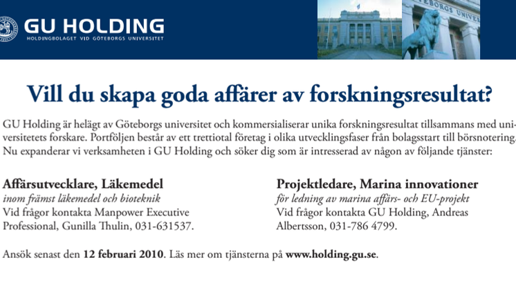 Vill du skapa goda affärer av forskningsresultat? Nu expanderar vi verksamheten i GU Holding och söker dig som är intresserad av att utveckla affärer inom områdena Läkemedel eller Marina innovationer.
