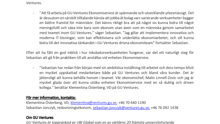 - ”Sebastian har redan från början med sin ambitiösa inställning till arbetet och dess tempo blivit en mycket uppskattad medarbetare både på GU Ventures och bland våra kunder. Det är jätteroligt att kunna behålla honom i teamet. Vår ekonomichef, Malin Linnell-Zovic, och jag är mycket glada över att kunna utöka enheten Ekonomiservice med en så duktig och driven kollega.” berättar Klementina Österberg, VD på GU Ventures.
