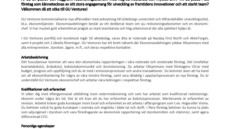 Är du en positiv och noggrann redovisningsekonom med hög servicekänsla och mycket driv? Vill du jobba i ett företag som kännetecknas av sitt stora engagemang för utveckling av framtidens innovationer och ett starkt team? Välkommen då att söka till GU Ventures!