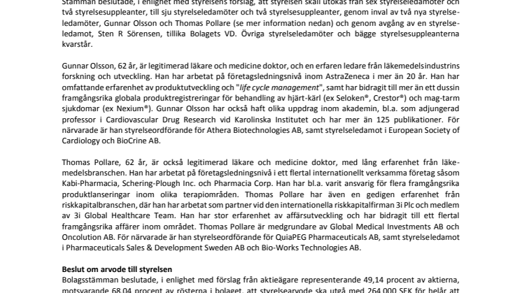 Stämman beslutade, i enlighet med styrelsens förslag, att styrelsen skall utökas från sex styrelseledamöter och två styrelsesuppleanter, till sju styrelseledamöter och två styrelsesuppleanter, genom inval av två nya styrelseledamöter, Gunnar Olsson och Thomas Pollare (se mer information nedan) och genom avgång av en styrelseledamot, Sten R Sörensen, tillika Bolagets VD. Övriga styrelseledamöter och bägge styrelsesuppleanterna kvarstår.