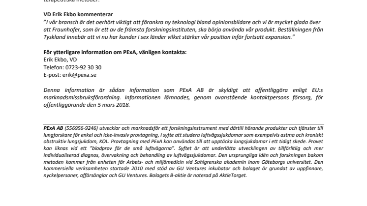 PExA har ingått avtal med Fraunhofer ITEM som innebär att kunden hyr ett komplett system, PExA 2.0, under sex månader. Ordervärdet, inklusive tillbehör, uppgår till cirka 150 000 kr och installation är planerad att ske i slutet av mars 2018.