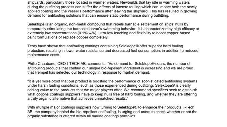 Philip Chaabane, CEO I-TECH AB, comments: “As demand for Selektope® soars, the number of antifouling products that contain our unique bio-repellent ingredient is increasing and we are proud that Hempel has selected our technology in response to market demand."