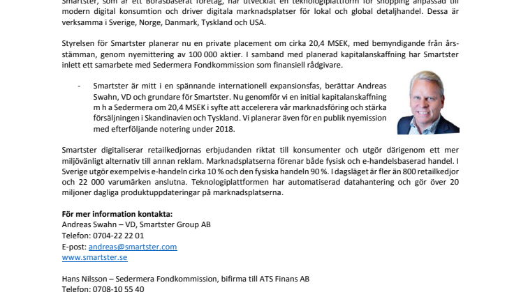 - Smartster är mitt i en spännande internationell expansionsfas, berättar Andreas Swahn, VD och grundare för Smartster. Nu genomför vi en initial kapitalanskaffning m h a Sedermera om 20,4 MSEK i syfte att accelerera vår marknadsföring och stärka försäljningen i Skandinavien och Tyskland. Vi planerar även för en publik nyemission med efterföljande notering under 2018.