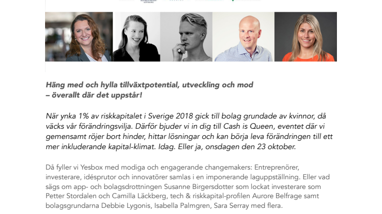 När ynka 1% av riskkapitalet i Sverige 2018 gick till bolag grundade av kvinnor, då väcks vår förändringsvilja. Därför bjuder vi in dig till Cash is Queen, eventet där vi gemensamt röjer bort hinder, hittar lösningar och kan börja leva förändringen till ett mer inkluderande kapital-klimat. Idag. Eller ja, onsdagen den 23 oktober.