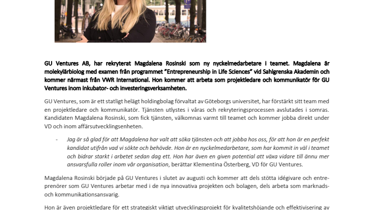 GU Ventures AB, har rekryterat Magdalena Rosinski som ny nyckelmedarbetare i teamet. Magdalena är molekylärbiolog med examen från programmet ”Entrepreneurship in Life Sciences” vid Sahlgrenska Akademin och kommer närmast från VWR International. Hon kommer att arbeta som projektledare och kommunikatör för GU Ventures inom inkubator- och investeringsverksamheten.