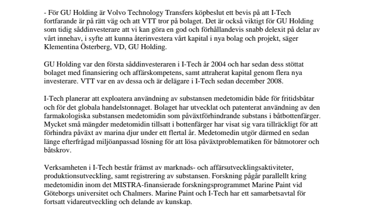 - För GU Holding är Volvo Technology Transfers köpbeslut ett bevis på att I-Tech fortfarande är på rätt väg och att VTT tror på bolaget. Det är också viktigt för GU Holding som tidig såddinvesterare att vi kan göra en god och förhållandevis snabb delexit på delar av vårt innehav, i syfte att kunna återinvestera vårt kapital i nya bolag och projekt, säger Klementina Österberg, VD, GU Holding.