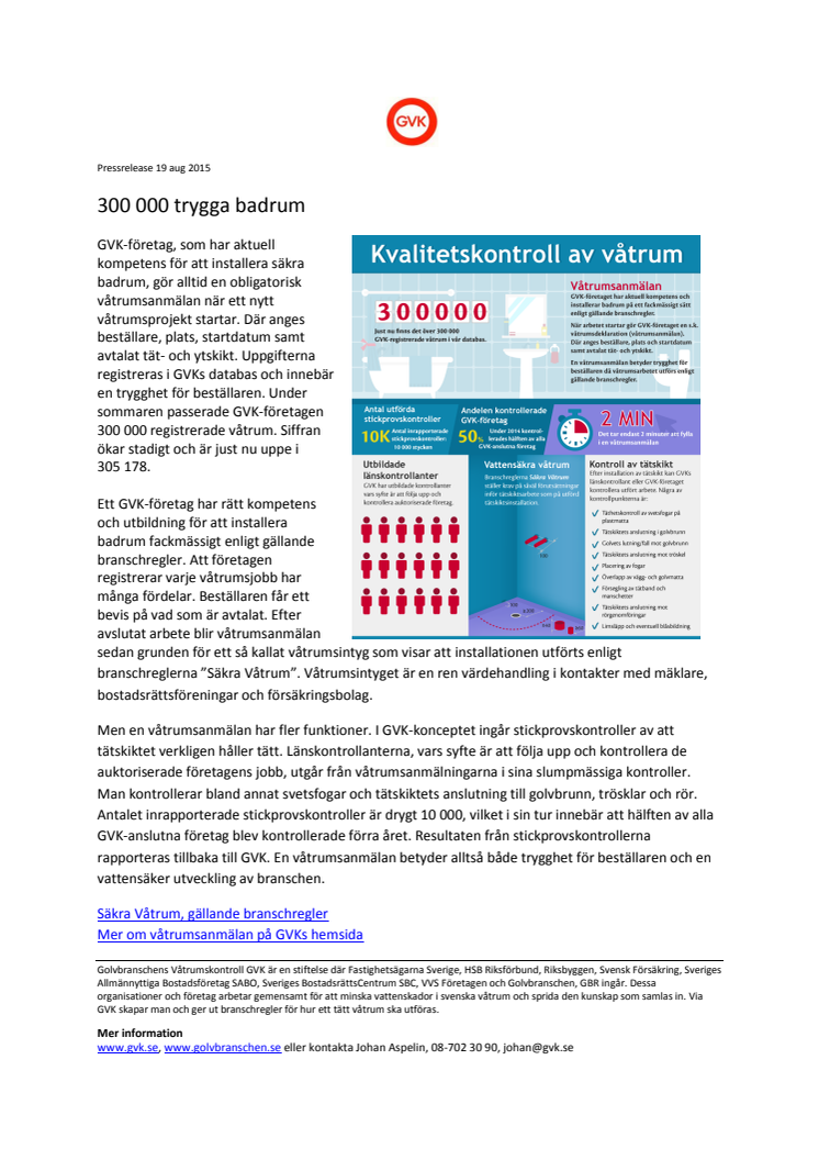GVK-företag, med aktuell kompetens för att installera säkra badrum, gör alltid en våtrumsanmälan när nya våtrumsprojekt startar. Där anges beställare, plats, startdatum samt avtalat tät- och ytskikt. Uppgifterna registreras i GVKs databas och innebär trygghet för beställaren. Under sommaren passerade GVK-företagen 300 000 registrerade våtrum. Siffran ökar stadigt och är just nu uppe i 305 178.