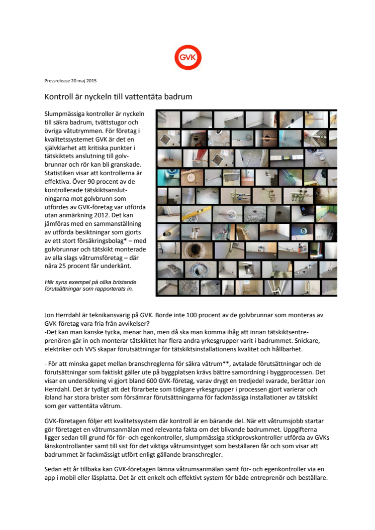 Slumpmässiga kontroller är nyckeln till säkra badrum och andra våtutrymmen. För företag i kvalitetssystemet GVK är det självklart att kritiska punkter i tätskiktets anslutning till golvbrunnar och rör kan bli granskade. Statistiken visar att kontrollerna är effektiva. Över 90 procent av de kontrollerade tätskiktsanslutningarna mot golvbrunn som utfördes av GVK-företag var utan anmärkning 2012.