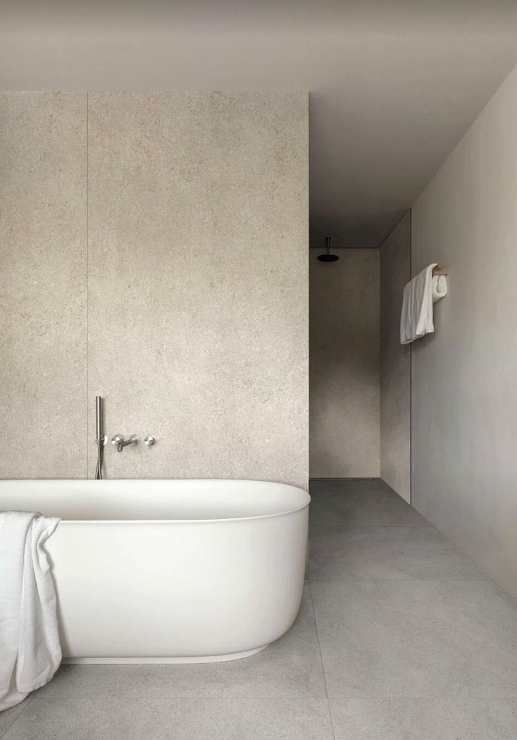 En dröm för vila och återhämtning… Sensi är en serie granitkeramik med fem naturkulörer att välja bland. På bilden Sensi White i storlek 120x240 cm. Intrycket av en hel keramisk vägg utan fog ger badrummet en lugn, minimalistisk och nästan meditativ känsla. www.kakelspecialisten.se