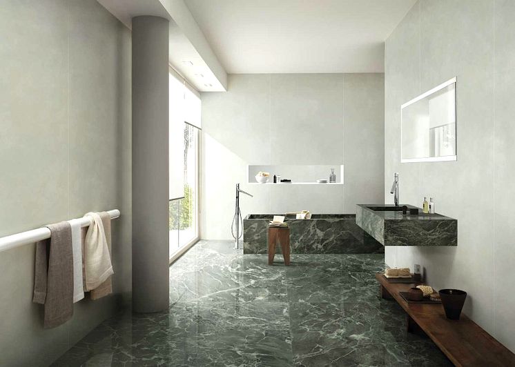 Badrumstrender 2022; Marazzi Grande Marble Look Verde Aver Lux (golv) och Marazzi Grande Resin Look Verde Chiaro Satin (vägg), granitkeramik, Kakeldaxgruppen