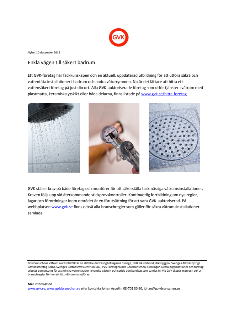 GVK ställer krav på både företag och montörer för att säkerställa fackmässiga våtrumsinstallationer. Kraven följs upp vid återkommande stickprovskontroller. Kontinuerlig fortbildning om nya regler, lagar och förordningar inom området är en förutsättning för att vara GVK-auktoriserad. På webbplatsen www.gvk.se finns också alla branschregler som gäller för säkra våtrumsinstallationer samlade.